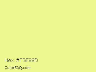 Hex #ebf88d Color is a light yellow color and the nearest color is Key Lime #e8f48c. Hex code #ebf88d and RGB value is rgb(235,248,141). In RGB color space, this color is composed of 92% red, 97% green, 55% blue, In CMYK color space, this color is composed of 5% cyan, 0% magenta, 43% yellow , 3% black , In HSL color space, this color has a hue angle of 67° , 88% saturation and 76% lightness.