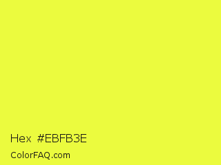 Hex #ebfb3e Color is a light yellow color and the nearest color is Golden Fizz #f5fb3d. Hex code #ebfb3e and RGB value is rgb(235,251,62). In RGB color space, this color is composed of 92% red, 98% green, 24% blue, In CMYK color space, this color is composed of 6% cyan, 0% magenta, 75% yellow , 2% black , In HSL color space, this color has a hue angle of 65° , 96% saturation and 61% lightness.
