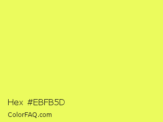 Hex #ebfb5d Color is a light yellow color and the nearest color is Canary #f3fb62. Hex code #ebfb5d and RGB value is rgb(235,251,93). In RGB color space, this color is composed of 92% red, 98% green, 36% blue, In CMYK color space, this color is composed of 6% cyan, 0% magenta, 63% yellow , 2% black , In HSL color space, this color has a hue angle of 66° , 95% saturation and 67% lightness.