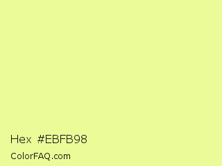 Hex #ebfb98 Color is a light yellow color and the nearest color is Jonquil #eeff9a. Hex code #ebfb98 and RGB value is rgb(235,251,152). In RGB color space, this color is composed of 92% red, 98% green, 60% blue, In CMYK color space, this color is composed of 6% cyan, 0% magenta, 39% yellow , 2% black , In HSL color space, this color has a hue angle of 70° , 93% saturation and 79% lightness.