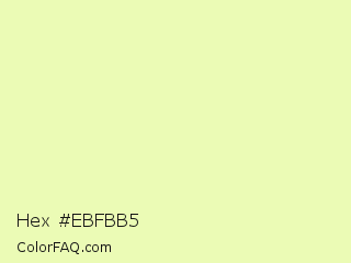Hex #ebfbb5 Color is a very light lime color and the nearest color is Tidal #f1ffad. Hex code #ebfbb5 and RGB value is rgb(235,251,181). In RGB color space, this color is composed of 92% red, 98% green, 71% blue, In CMYK color space, this color is composed of 6% cyan, 0% magenta, 28% yellow , 2% black , In HSL color space, this color has a hue angle of 74° , 90% saturation and 85% lightness.