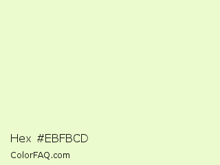 Hex #ebfbcd Color is a very light green color and the nearest color is Chiffon #f1ffc8. Hex code #ebfbcd and RGB value is rgb(235,251,205). In RGB color space, this color is composed of 92% red, 98% green, 80% blue, In CMYK color space, this color is composed of 6% cyan, 0% magenta, 18% yellow , 2% black , In HSL color space, this color has a hue angle of 81° , 85% saturation and 89% lightness.