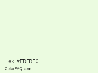 Hex #ebfbe0 Color is a very light green color and the nearest color is Rice Flower #eeffe2. Hex code #ebfbe0 and RGB value is rgb(235,251,224). In RGB color space, this color is composed of 92% red, 98% green, 88% blue, In CMYK color space, this color is composed of 6% cyan, 0% magenta, 11% yellow , 2% black , In HSL color space, this color has a hue angle of 96° , 77% saturation and 93% lightness.