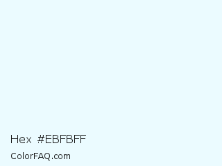 Hex #ebfbff Color is a almost white cyan color and the nearest color is Twilight Blue #eefdff. Hex code #ebfbff and RGB value is rgb(235,251,255). In RGB color space, this color is composed of 92% red, 98% green, 100% blue, In CMYK color space, this color is composed of 8% cyan, 2% magenta, 0% yellow , 0% black , In HSL color space, this color has a hue angle of 192° , 100% saturation and 96% lightness.