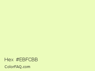 Hex #ebfcbb Color is a very light lime color and the nearest color is Australian Mint #f5ffbe. Hex code #ebfcbb and RGB value is rgb(235,252,187). In RGB color space, this color is composed of 92% red, 99% green, 73% blue, In CMYK color space, this color is composed of 7% cyan, 0% magenta, 26% yellow , 1% black , In HSL color space, this color has a hue angle of 76° , 92% saturation and 86% lightness.
