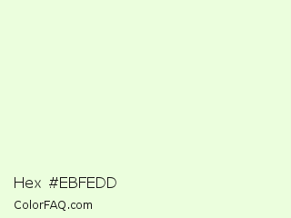 Hex #ebfedd Color is a very light green color and the nearest color is Nyanza #e9ffdb. Hex code #ebfedd and RGB value is rgb(235,254,221). In RGB color space, this color is composed of 92% red, 100% green, 87% blue, In CMYK color space, this color is composed of 7% cyan, 0% magenta, 13% yellow , 0% black , In HSL color space, this color has a hue angle of 95° , 94% saturation and 93% lightness.