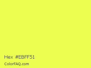 Hex #ebff51 Color is a light yellow color and the nearest color is Starship #ecf245. Hex code #ebff51 and RGB value is rgb(235,255,81). In RGB color space, this color is composed of 92% red, 100% green, 32% blue, In CMYK color space, this color is composed of 8% cyan, 0% magenta, 68% yellow , 0% black , In HSL color space, this color has a hue angle of 67° , 100% saturation and 66% lightness.
