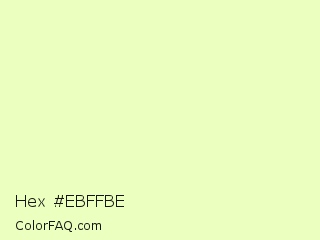 Hex #ebffbe Color is a very light lime color and the nearest color is Australian Mint #f5ffbe. Hex code #ebffbe and RGB value is rgb(235,255,190). In RGB color space, this color is composed of 92% red, 100% green, 75% blue, In CMYK color space, this color is composed of 8% cyan, 0% magenta, 25% yellow , 0% black , In HSL color space, this color has a hue angle of 78° , 100% saturation and 87% lightness.