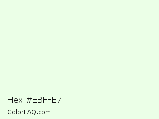 Hex #ebffe7 Color is a almost white green color and the nearest color is Hint Of Green #e6ffe9. Hex code #ebffe7 and RGB value is rgb(235,255,231). In RGB color space, this color is composed of 92% red, 100% green, 91% blue, In CMYK color space, this color is composed of 8% cyan, 0% magenta, 9% yellow , 0% black , In HSL color space, this color has a hue angle of 110° , 100% saturation and 95% lightness.