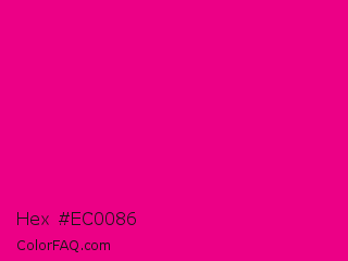 Hex #ec0086 Color is a normal magenta color and the nearest color is Mexican Pink #e4007c. Hex code #ec0086 and RGB value is rgb(236,0,134). In RGB color space, this color is composed of 93% red, 0% green, 53% blue, In CMYK color space, this color is composed of 0% cyan, 100% magenta, 43% yellow , 7% black , In HSL color space, this color has a hue angle of 326° , 100% saturation and 46% lightness.