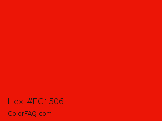 Hex #ec1506 Color is a normal red color and the nearest color is KU Crimson #e8000d. Hex code #ec1506 and RGB value is rgb(236,21,6). In RGB color space, this color is composed of 93% red, 8% green, 2% blue, In CMYK color space, this color is composed of 0% cyan, 91% magenta, 97% yellow , 7% black , In HSL color space, this color has a hue angle of 4° , 95% saturation and 47% lightness.
