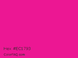 Hex #ec1793 Color is a normal magenta color and the nearest color is Barbie Pink #e0218a. Hex code #ec1793 and RGB value is rgb(236,23,147). In RGB color space, this color is composed of 93% red, 9% green, 58% blue, In CMYK color space, this color is composed of 0% cyan, 90% magenta, 38% yellow , 7% black , In HSL color space, this color has a hue angle of 325° , 85% saturation and 51% lightness.