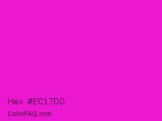 Hex #ec17d0 Color is a normal magenta color and the nearest color is Hot Magenta #ff1dce. Hex code #ec17d0 and RGB value is rgb(236,23,208). In RGB color space, this color is composed of 93% red, 9% green, 82% blue, In CMYK color space, this color is composed of 0% cyan, 90% magenta, 12% yellow , 7% black , In HSL color space, this color has a hue angle of 308° , 85% saturation and 51% lightness.