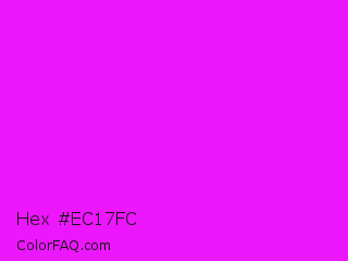 Hex #ec17fc Color is a normal magenta color and the nearest color is Phlox #df00ff. Hex code #ec17fc and RGB value is rgb(236,23,252). In RGB color space, this color is composed of 93% red, 9% green, 99% blue, In CMYK color space, this color is composed of 6% cyan, 91% magenta, 0% yellow , 1% black , In HSL color space, this color has a hue angle of 296° , 97% saturation and 54% lightness.