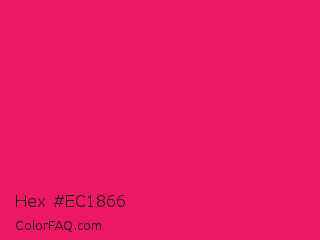 Hex #ec1866 Color is a normal rose color and the nearest color is Ruby #e0115f. Hex code #ec1866 and RGB value is rgb(236,24,102). In RGB color space, this color is composed of 93% red, 9% green, 40% blue, In CMYK color space, this color is composed of 0% cyan, 90% magenta, 57% yellow , 7% black , In HSL color space, this color has a hue angle of 338° , 85% saturation and 51% lightness.