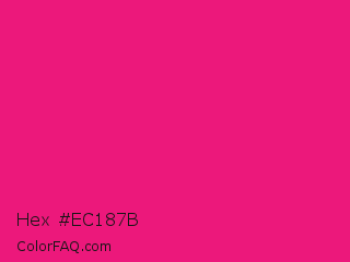 Hex #ec187b Color is a normal rose color and the nearest color is Vivid Cerise #da1d81. Hex code #ec187b and RGB value is rgb(236,24,123). In RGB color space, this color is composed of 93% red, 9% green, 48% blue, In CMYK color space, this color is composed of 0% cyan, 90% magenta, 48% yellow , 7% black , In HSL color space, this color has a hue angle of 332° , 85% saturation and 51% lightness.