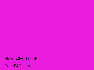 Hex #ec1cdf Color is a normal magenta color and the nearest color is Hot Magenta #ff1dce. Hex code #ec1cdf and RGB value is rgb(236,28,223). In RGB color space, this color is composed of 93% red, 11% green, 87% blue, In CMYK color space, this color is composed of 0% cyan, 88% magenta, 6% yellow , 7% black , In HSL color space, this color has a hue angle of 304° , 85% saturation and 52% lightness.