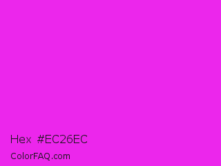 Hex #ec26ec Color is a normal magenta color and the nearest color is Hot Magenta #ff1dce. Hex code #ec26ec and RGB value is rgb(236,38,236). In RGB color space, this color is composed of 93% red, 15% green, 93% blue, In CMYK color space, this color is composed of 0% cyan, 84% magenta, 0% yellow , 7% black , In HSL color space, this color has a hue angle of 300° , 84% saturation and 54% lightness.