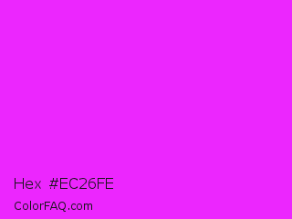 Hex #ec26fe Color is a normal magenta color and the nearest color is Phlox #df00ff. Hex code #ec26fe and RGB value is rgb(236,38,254). In RGB color space, this color is composed of 93% red, 15% green, 100% blue, In CMYK color space, this color is composed of 7% cyan, 85% magenta, 0% yellow , 0% black , In HSL color space, this color has a hue angle of 295° , 99% saturation and 57% lightness.