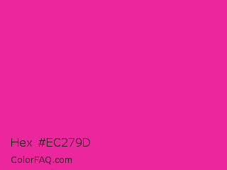 Hex #ec279d Color is a normal magenta color and the nearest color is Frostbite #e936a7. Hex code #ec279d and RGB value is rgb(236,39,157). In RGB color space, this color is composed of 93% red, 15% green, 62% blue, In CMYK color space, this color is composed of 0% cyan, 83% magenta, 33% yellow , 7% black , In HSL color space, this color has a hue angle of 324° , 84% saturation and 54% lightness.
