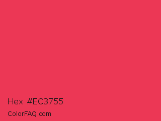 Hex #ec3755 Color is a normal red color and the nearest color is Desire #ea3c53. Hex code #ec3755 and RGB value is rgb(236,55,85). In RGB color space, this color is composed of 93% red, 22% green, 33% blue, In CMYK color space, this color is composed of 0% cyan, 77% magenta, 64% yellow , 7% black , In HSL color space, this color has a hue angle of 350° , 83% saturation and 57% lightness.
