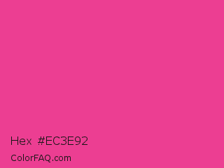 Hex #ec3e92 Color is a normal rose color and the nearest color is Cerise Pink #ec3b83. Hex code #ec3e92 and RGB value is rgb(236,62,146). In RGB color space, this color is composed of 93% red, 24% green, 57% blue, In CMYK color space, this color is composed of 0% cyan, 74% magenta, 38% yellow , 7% black , In HSL color space, this color has a hue angle of 331° , 82% saturation and 58% lightness.