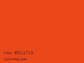Hex #ec4719 Color is a normal red color and the nearest color is Pomegranate #f34723. Hex code #ec4719 and RGB value is rgb(236,71,25). In RGB color space, this color is composed of 93% red, 28% green, 10% blue, In CMYK color space, this color is composed of 0% cyan, 70% magenta, 89% yellow , 7% black , In HSL color space, this color has a hue angle of 13° , 85% saturation and 51% lightness.