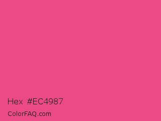Hex #ec4987 Color is a light rose color and the nearest color is French Rose #f64a8a. Hex code #ec4987 and RGB value is rgb(236,73,135). In RGB color space, this color is composed of 93% red, 29% green, 53% blue, In CMYK color space, this color is composed of 0% cyan, 69% magenta, 43% yellow , 7% black , In HSL color space, this color has a hue angle of 337° , 81% saturation and 61% lightness.