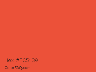 Hex #ec5139 Color is a normal red color and the nearest color is Carmine Pink #eb4c42. Hex code #ec5139 and RGB value is rgb(236,81,57). In RGB color space, this color is composed of 93% red, 32% green, 22% blue, In CMYK color space, this color is composed of 0% cyan, 66% magenta, 76% yellow , 7% black , In HSL color space, this color has a hue angle of 8° , 82% saturation and 57% lightness.