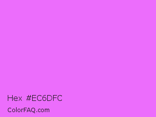 Hex #ec6dfc Color is a light magenta color and the nearest color is Heliotrope #df73ff. Hex code #ec6dfc and RGB value is rgb(236,109,252). In RGB color space, this color is composed of 93% red, 43% green, 99% blue, In CMYK color space, this color is composed of 6% cyan, 57% magenta, 0% yellow , 1% black , In HSL color space, this color has a hue angle of 293° , 96% saturation and 71% lightness.
