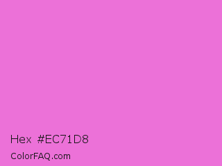 Hex #ec71d8 Color is a light magenta color and the nearest color is Orchid #da70d6. Hex code #ec71d8 and RGB value is rgb(236,113,216). In RGB color space, this color is composed of 93% red, 44% green, 85% blue, In CMYK color space, this color is composed of 0% cyan, 52% magenta, 8% yellow , 7% black , In HSL color space, this color has a hue angle of 310° , 76% saturation and 68% lightness.