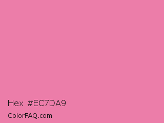 Hex #ec7da9 Color is a light rose color and the nearest color is Carissma #ea88a8. Hex code #ec7da9 and RGB value is rgb(236,125,169). In RGB color space, this color is composed of 93% red, 49% green, 66% blue, In CMYK color space, this color is composed of 0% cyan, 47% magenta, 28% yellow , 7% black , In HSL color space, this color has a hue angle of 336° , 74% saturation and 71% lightness.