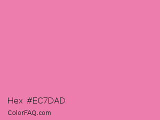 Hex #ec7dad Color is a light rose color and the nearest color is Carissma #ea88a8. Hex code #ec7dad and RGB value is rgb(236,125,173). In RGB color space, this color is composed of 93% red, 49% green, 68% blue, In CMYK color space, this color is composed of 0% cyan, 47% magenta, 27% yellow , 7% black , In HSL color space, this color has a hue angle of 334° , 74% saturation and 71% lightness.