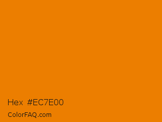 Hex #ec7e00 Color is a normal orange color and the nearest color is Gold Drop #f18200. Hex code #ec7e00 and RGB value is rgb(236,126,0). In RGB color space, this color is composed of 93% red, 49% green, 0% blue, In CMYK color space, this color is composed of 0% cyan, 47% magenta, 100% yellow , 7% black , In HSL color space, this color has a hue angle of 32° , 100% saturation and 46% lightness.