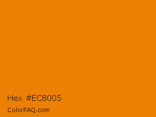 Hex #ec8005 Color is a normal orange color and the nearest color is Tahiti Gold #e97c07. Hex code #ec8005 and RGB value is rgb(236,128,5). In RGB color space, this color is composed of 93% red, 50% green, 2% blue, In CMYK color space, this color is composed of 0% cyan, 46% magenta, 98% yellow , 7% black , In HSL color space, this color has a hue angle of 32° , 96% saturation and 47% lightness.