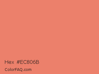 Hex #ec806b Color is a light red color and the nearest color is Salmon #fa8072. Hex code #ec806b and RGB value is rgb(236,128,107). In RGB color space, this color is composed of 93% red, 50% green, 42% blue, In CMYK color space, this color is composed of 0% cyan, 46% magenta, 55% yellow , 7% black , In HSL color space, this color has a hue angle of 10° , 77% saturation and 67% lightness.