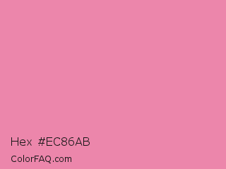 Hex #ec86ab Color is a light rose color and the nearest color is Carissma #ea88a8. Hex code #ec86ab and RGB value is rgb(236,134,171). In RGB color space, this color is composed of 93% red, 53% green, 67% blue, In CMYK color space, this color is composed of 0% cyan, 43% magenta, 28% yellow , 7% black , In HSL color space, this color has a hue angle of 338° , 73% saturation and 73% lightness.