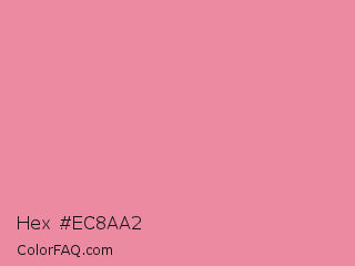 Hex #ec8aa2 Color is a light red color and the nearest color is Carissma #ea88a8. Hex code #ec8aa2 and RGB value is rgb(236,138,162). In RGB color space, this color is composed of 93% red, 54% green, 64% blue, In CMYK color space, this color is composed of 0% cyan, 42% magenta, 31% yellow , 7% black , In HSL color space, this color has a hue angle of 345° , 72% saturation and 73% lightness.