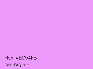 Hex #ec9afb Color is a light purple color and the nearest color is Rich Brilliant Lavender #f1a7fe. Hex code #ec9afb and RGB value is rgb(236,154,251). In RGB color space, this color is composed of 93% red, 60% green, 98% blue, In CMYK color space, this color is composed of 6% cyan, 39% magenta, 0% yellow , 2% black , In HSL color space, this color has a hue angle of 291° , 92% saturation and 79% lightness.