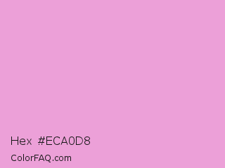Hex #eca0d8 Color is a light magenta color and the nearest color is Light Orchid #e6a8d7. Hex code #eca0d8 and RGB value is rgb(236,160,216). In RGB color space, this color is composed of 93% red, 63% green, 85% blue, In CMYK color space, this color is composed of 0% cyan, 32% magenta, 8% yellow , 7% black , In HSL color space, this color has a hue angle of 316° , 67% saturation and 78% lightness.