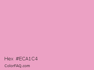 Hex #eca1c4 Color is a light rose color and the nearest color is Kobi #e79fc4. Hex code #eca1c4 and RGB value is rgb(236,161,196). In RGB color space, this color is composed of 93% red, 63% green, 77% blue, In CMYK color space, this color is composed of 0% cyan, 32% magenta, 17% yellow , 7% black , In HSL color space, this color has a hue angle of 332° , 66% saturation and 78% lightness.