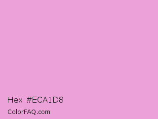 Hex #eca1d8 Color is a light magenta color and the nearest color is Light Orchid #e6a8d7. Hex code #eca1d8 and RGB value is rgb(236,161,216). In RGB color space, this color is composed of 93% red, 63% green, 85% blue, In CMYK color space, this color is composed of 0% cyan, 32% magenta, 8% yellow , 7% black , In HSL color space, this color has a hue angle of 316° , 66% saturation and 78% lightness.