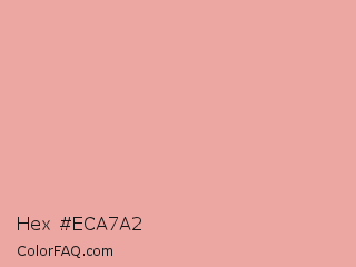 Hex #eca7a2 Color is a light red color and the nearest color is Pastel Pink #dea5a4. Hex code #eca7a2 and RGB value is rgb(236,167,162). In RGB color space, this color is composed of 93% red, 65% green, 64% blue, In CMYK color space, this color is composed of 0% cyan, 29% magenta, 31% yellow , 7% black , In HSL color space, this color has a hue angle of 4° , 66% saturation and 78% lightness.