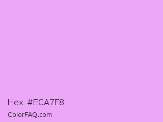 Hex #eca7f8 Color is a very light purple color and the nearest color is Rich Brilliant Lavender #f1a7fe. Hex code #eca7f8 and RGB value is rgb(236,167,248). In RGB color space, this color is composed of 93% red, 65% green, 97% blue, In CMYK color space, this color is composed of 5% cyan, 33% magenta, 0% yellow , 3% black , In HSL color space, this color has a hue angle of 291° , 85% saturation and 81% lightness.