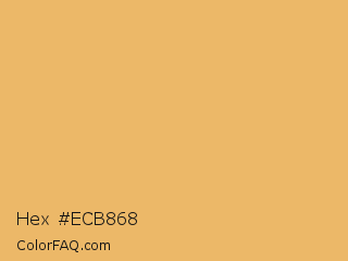 Hex #ecb868 Color is a light orange color and the nearest color is Porsche #eaae69. Hex code #ecb868 and RGB value is rgb(236,184,104). In RGB color space, this color is composed of 93% red, 72% green, 41% blue, In CMYK color space, this color is composed of 0% cyan, 22% magenta, 56% yellow , 7% black , In HSL color space, this color has a hue angle of 36° , 78% saturation and 67% lightness.