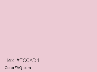 Hex #eccad4 Color is a very light rose color and the nearest color is Queen Pink #e8ccd7. Hex code #eccad4 and RGB value is rgb(236,202,212). In RGB color space, this color is composed of 93% red, 79% green, 83% blue, In CMYK color space, this color is composed of 0% cyan, 14% magenta, 10% yellow , 7% black , In HSL color space, this color has a hue angle of 342° , 47% saturation and 86% lightness.