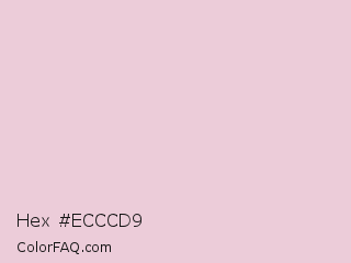 Hex #ecccd9 Color is a very light rose color and the nearest color is Queen Pink #e8ccd7. Hex code #ecccd9 and RGB value is rgb(236,204,217). In RGB color space, this color is composed of 93% red, 80% green, 85% blue, In CMYK color space, this color is composed of 0% cyan, 14% magenta, 8% yellow , 7% black , In HSL color space, this color has a hue angle of 336° , 46% saturation and 86% lightness.