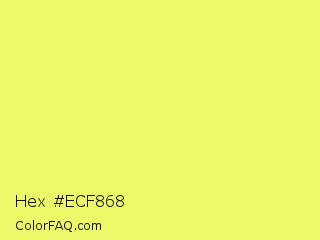 Hex #ecf868 Color is a light yellow color and the nearest color is Canary #f3fb62. Hex code #ecf868 and RGB value is rgb(236,248,104). In RGB color space, this color is composed of 93% red, 97% green, 41% blue, In CMYK color space, this color is composed of 5% cyan, 0% magenta, 58% yellow , 3% black , In HSL color space, this color has a hue angle of 65° , 91% saturation and 69% lightness.