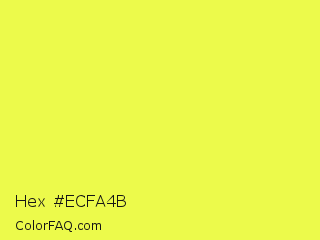Hex #ecfa4b Color is a light yellow color and the nearest color is Starship #ecf245. Hex code #ecfa4b and RGB value is rgb(236,250,75). In RGB color space, this color is composed of 93% red, 98% green, 29% blue, In CMYK color space, this color is composed of 6% cyan, 0% magenta, 70% yellow , 2% black , In HSL color space, this color has a hue angle of 65° , 95% saturation and 64% lightness.