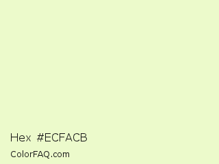 Hex #ecfacb Color is a very light lime color and the nearest color is Chiffon #f1ffc8. Hex code #ecfacb and RGB value is rgb(236,250,203). In RGB color space, this color is composed of 93% red, 98% green, 80% blue, In CMYK color space, this color is composed of 6% cyan, 0% magenta, 19% yellow , 2% black , In HSL color space, this color has a hue angle of 78° , 82% saturation and 89% lightness.